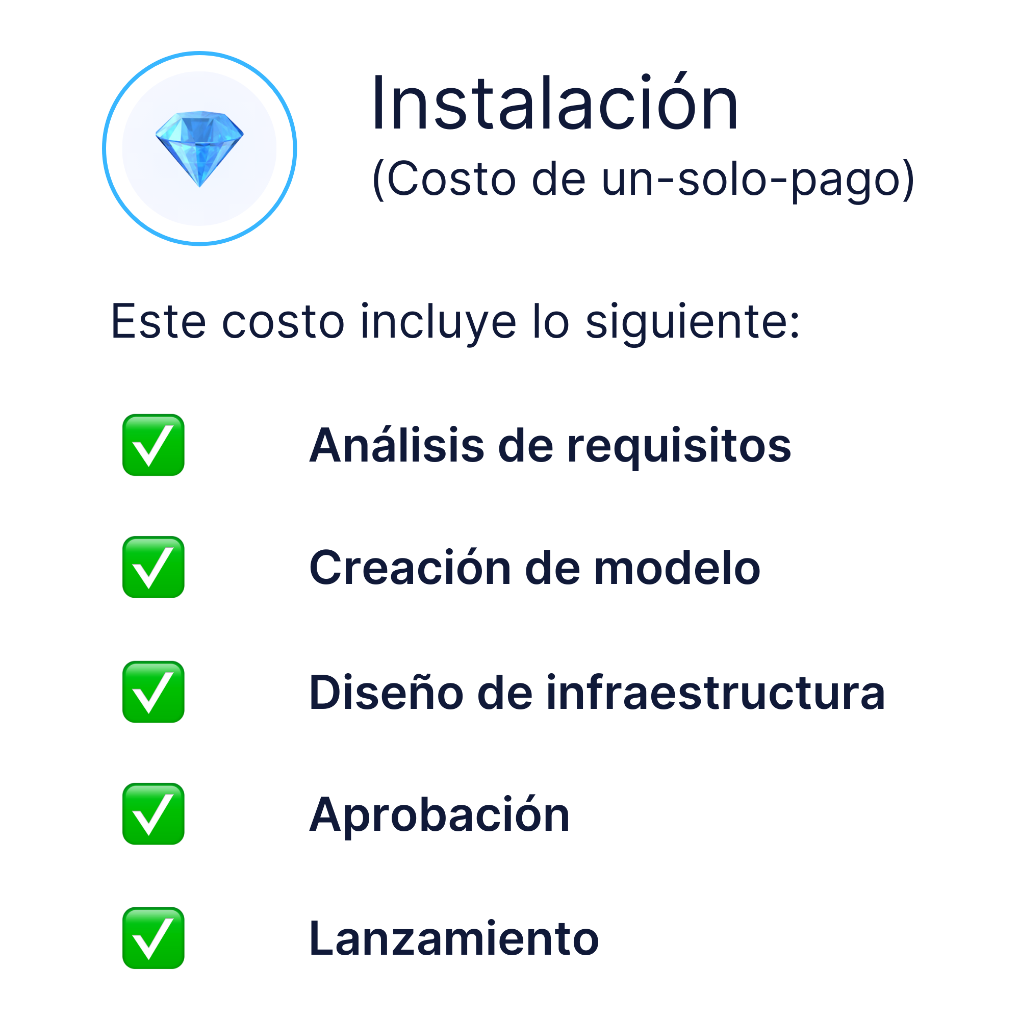1. Costo de Instalación: Un costo de una-sola-vez que cubre el diseño, construcción y lanzamiento de tu IA. Te enviamos un estimado tras revisar tu información y requisitos para asegurarnos de que se ajuste a tus necesidades específicas.