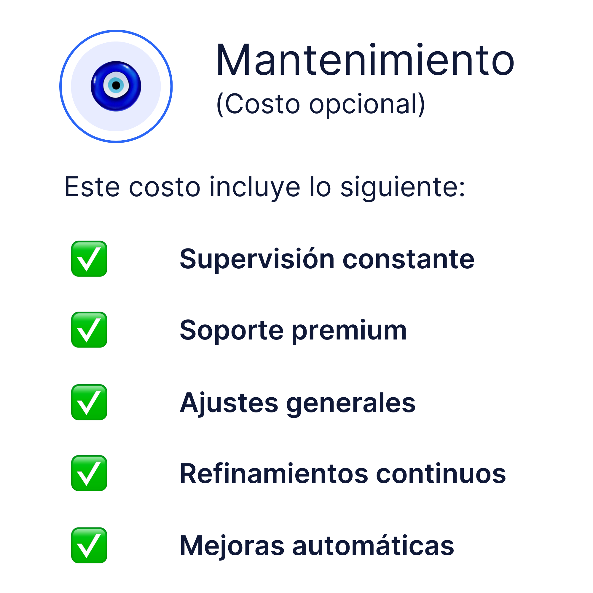 2. Costo de Mantenimiento: Un costo opcional recurrente que incluye actualizaciones, supervisión y la posibilidad de realizar ajustes a tu IA.